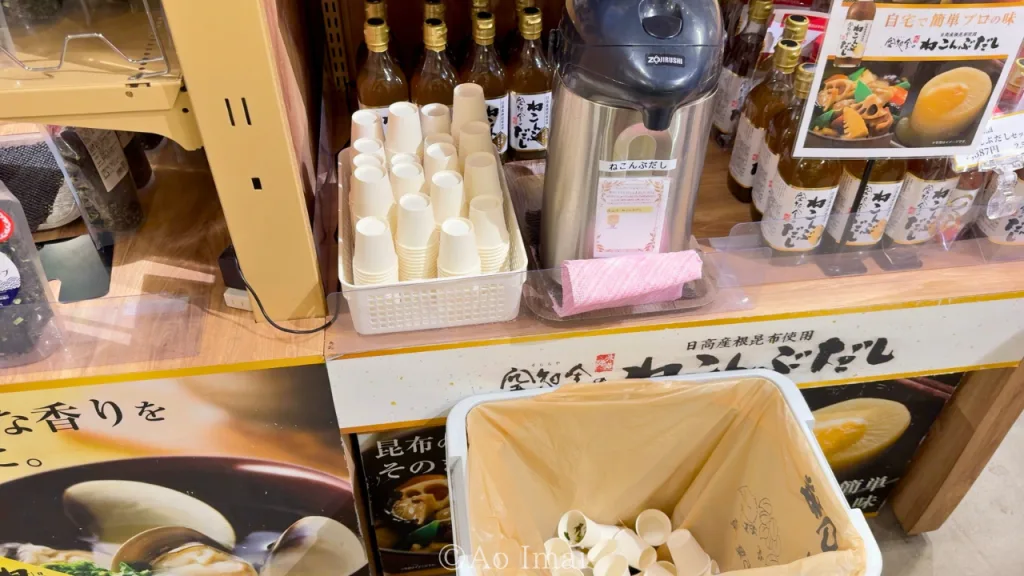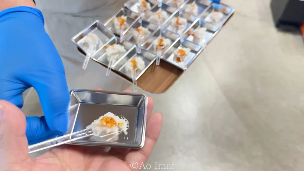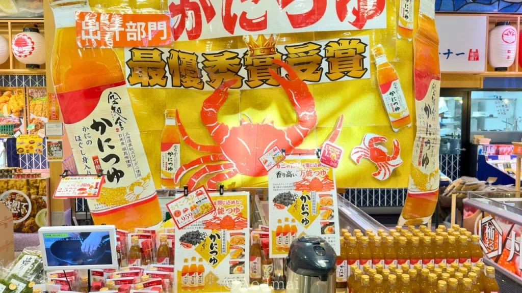 海産物コーナーには「かにつゆ」というカニのほぐし身入りの出汁調味料もありました。お味噌汁の出汁にしたり、チャーハンに加えたりすることでカニ風味の香り高い料理に仕上がります。こちらも試食可能でした。